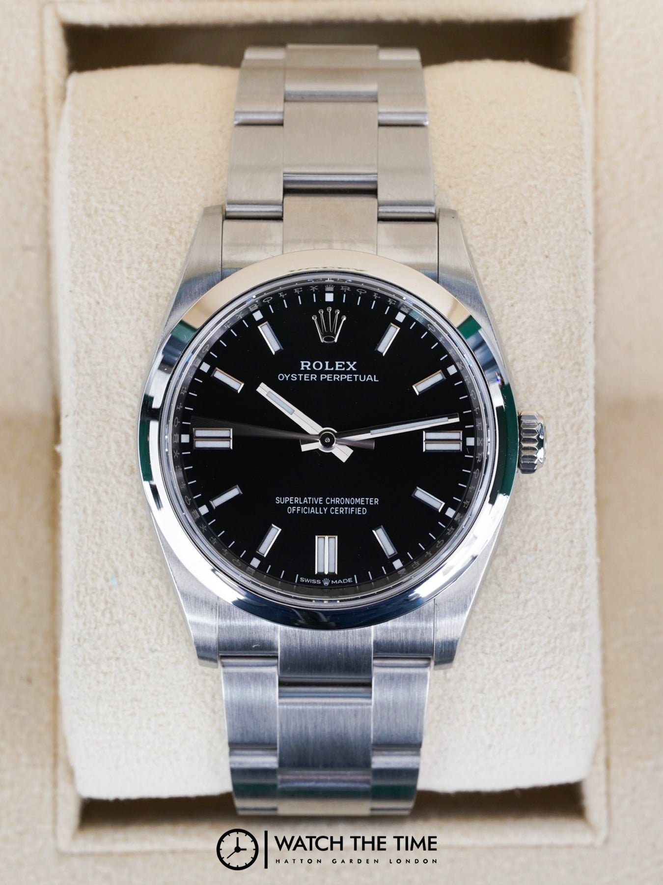 36mm stainless steel case, smooth bezel. Crown set on the right side of the watch. Black dial, stainless steel oyster bracelet.
