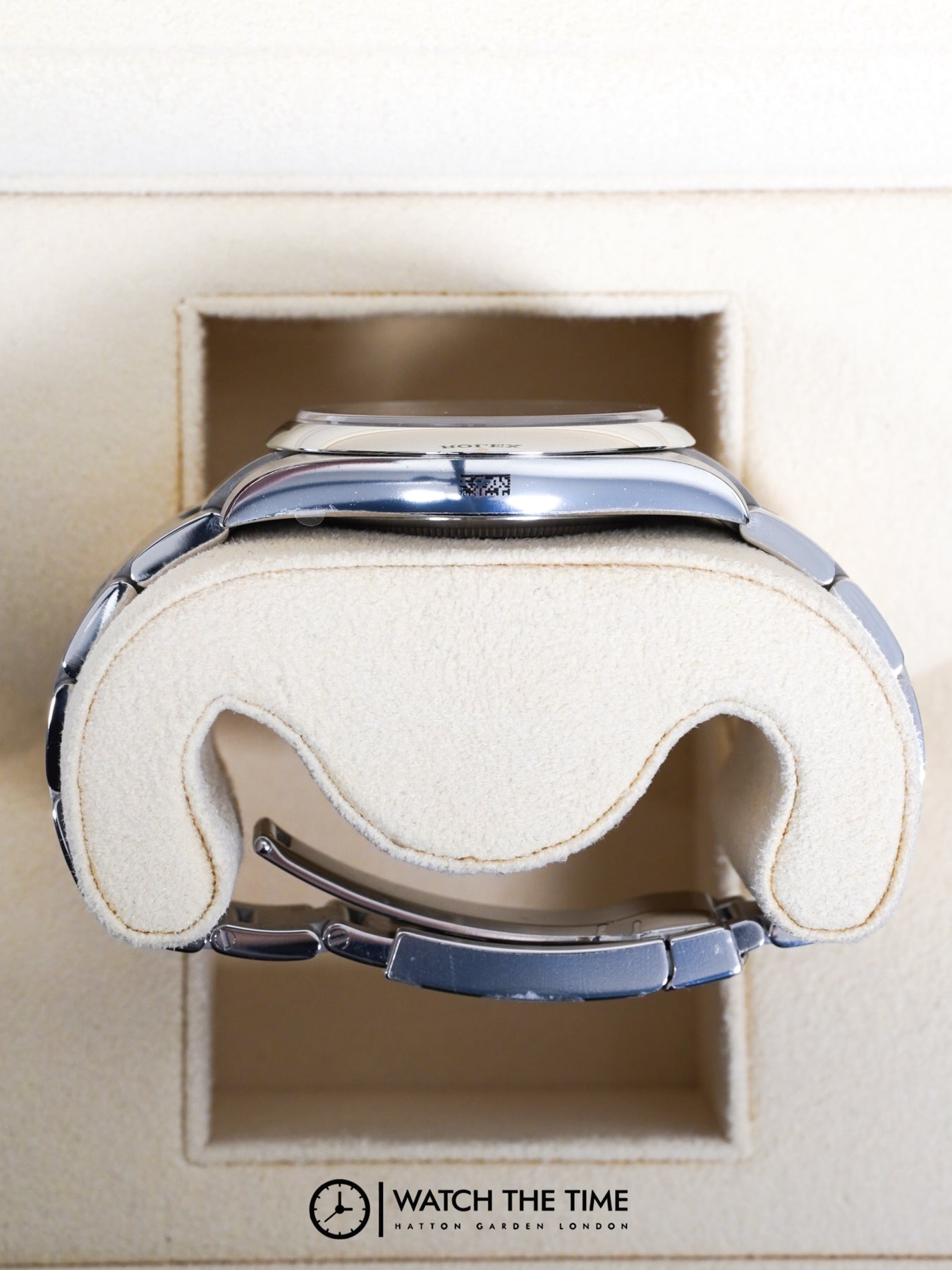 41mm stainless steel case, smooth bezel, crown set on the right side of the watch, navy blue dial, stainless steel oyster bracelet.