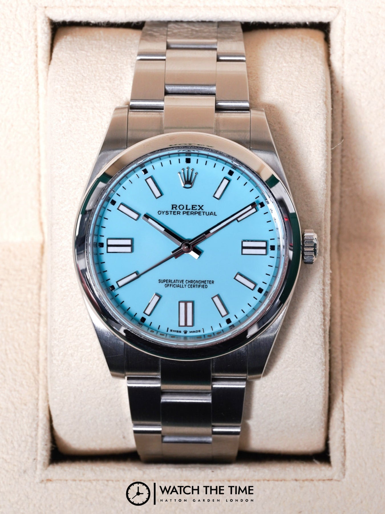 41mm Stainless Steel Case, Smooth Bezel, Crown Set On The Right Side Of The Watch. Blue Tiffany Dial, Stainless Steel Oyster Bracelet.