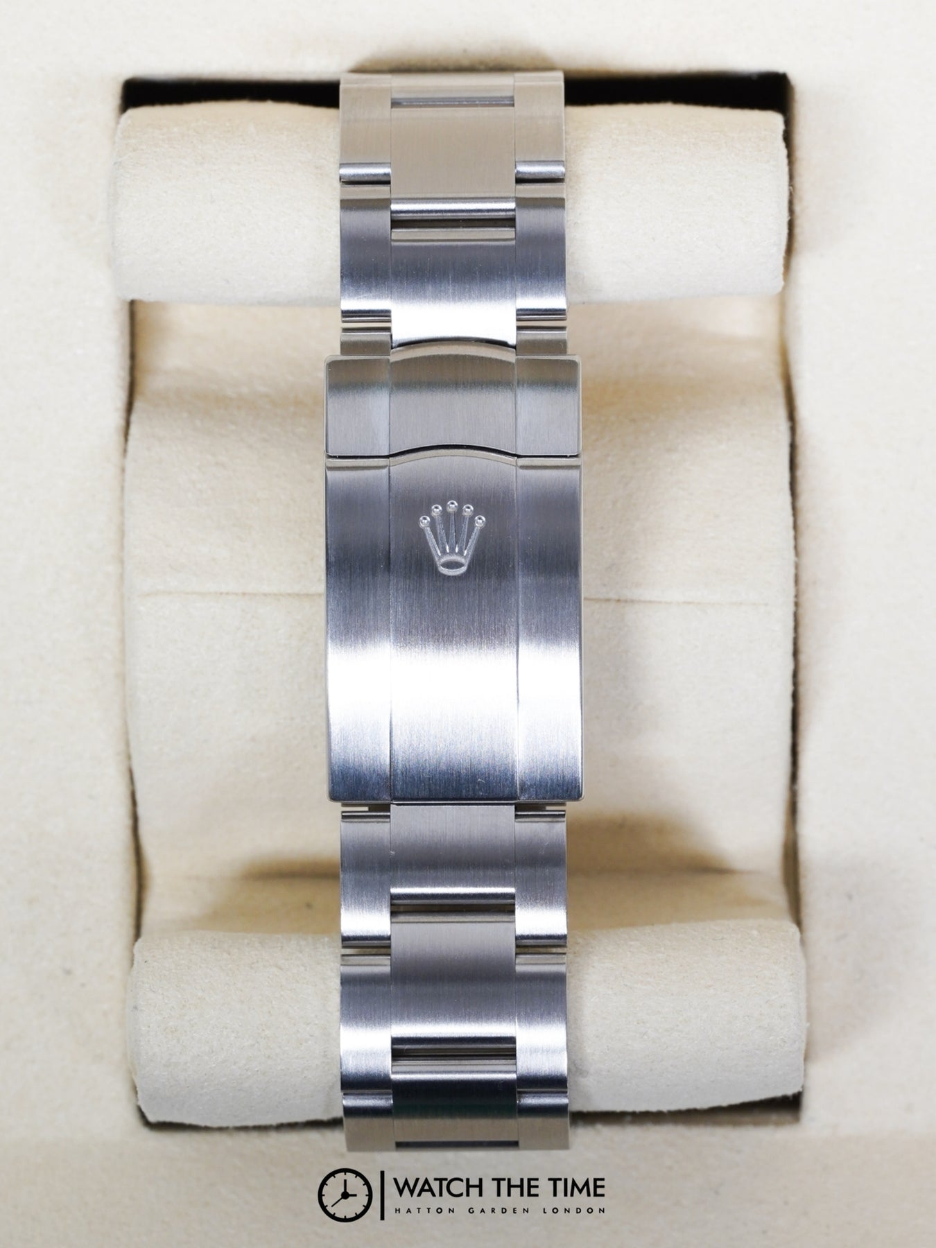 41mm stainless steel case, smooth stainless steel bezel. Crown set on the right side of the watch. Pink dial, stainless steel oyster bracelet.