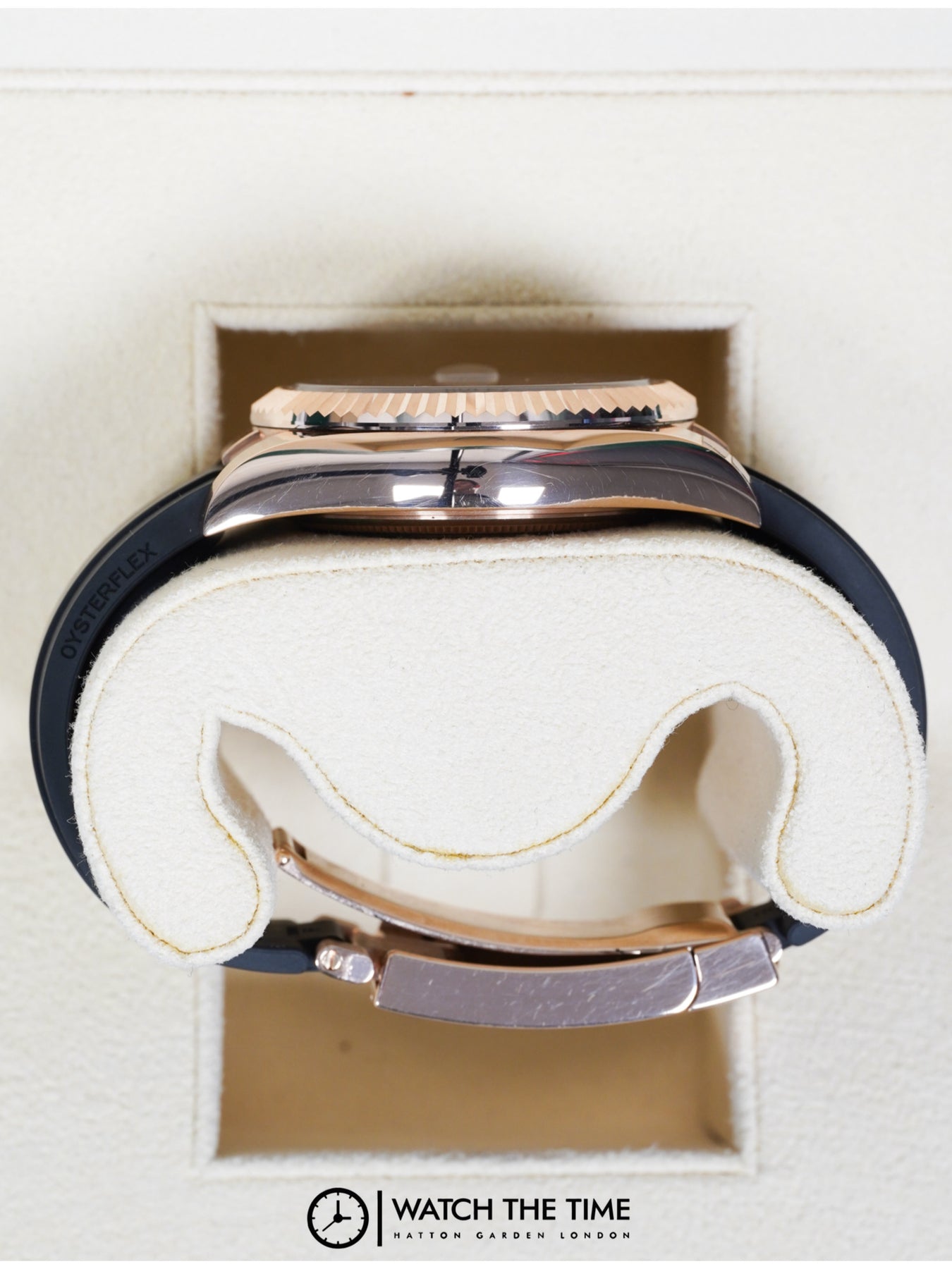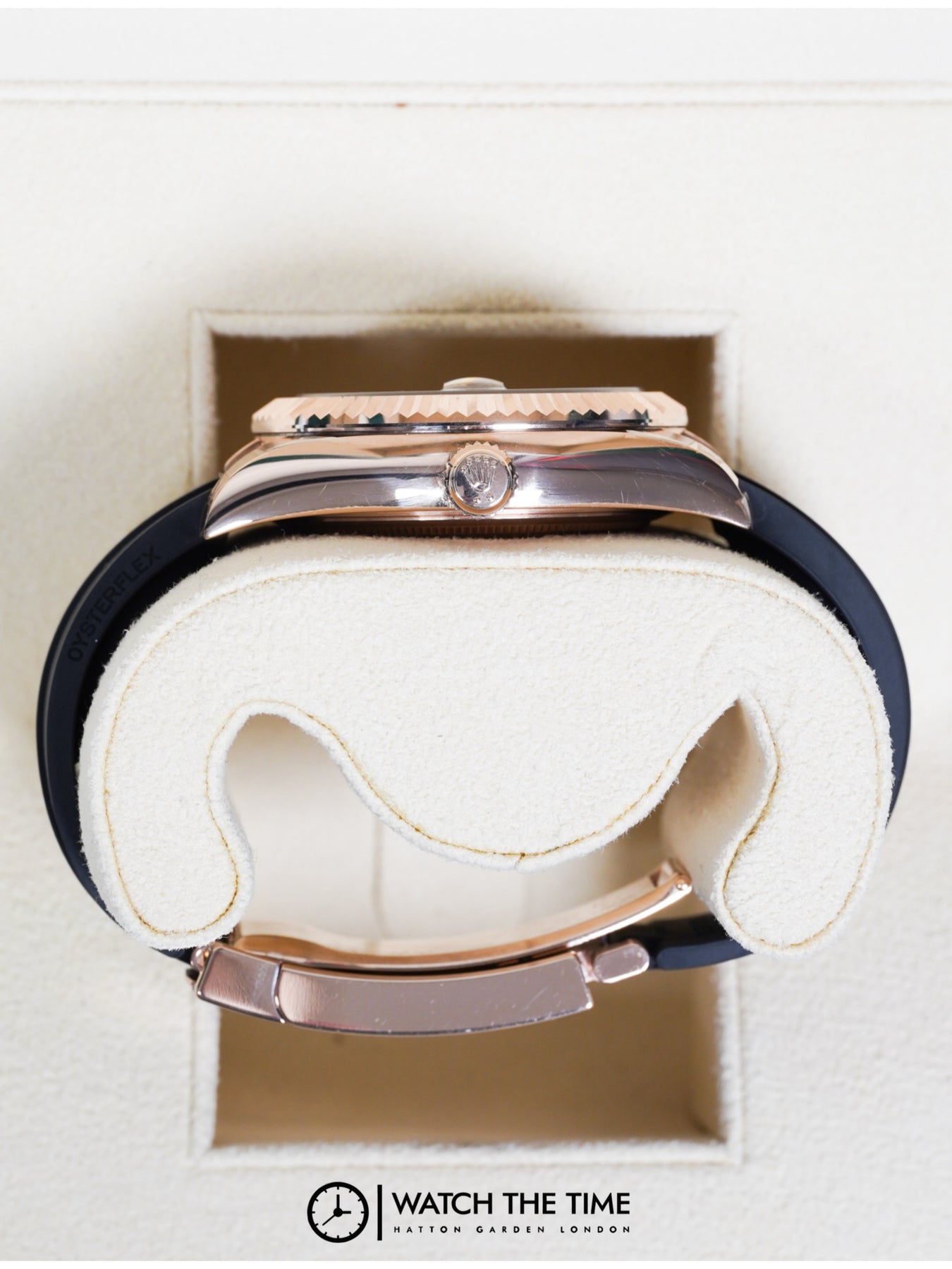 42mm rose gold case, rose gold fluted bezel. Crown set on the right side of the watch as well as the date. Chocolate dial, rubber oysterflex bracelet.