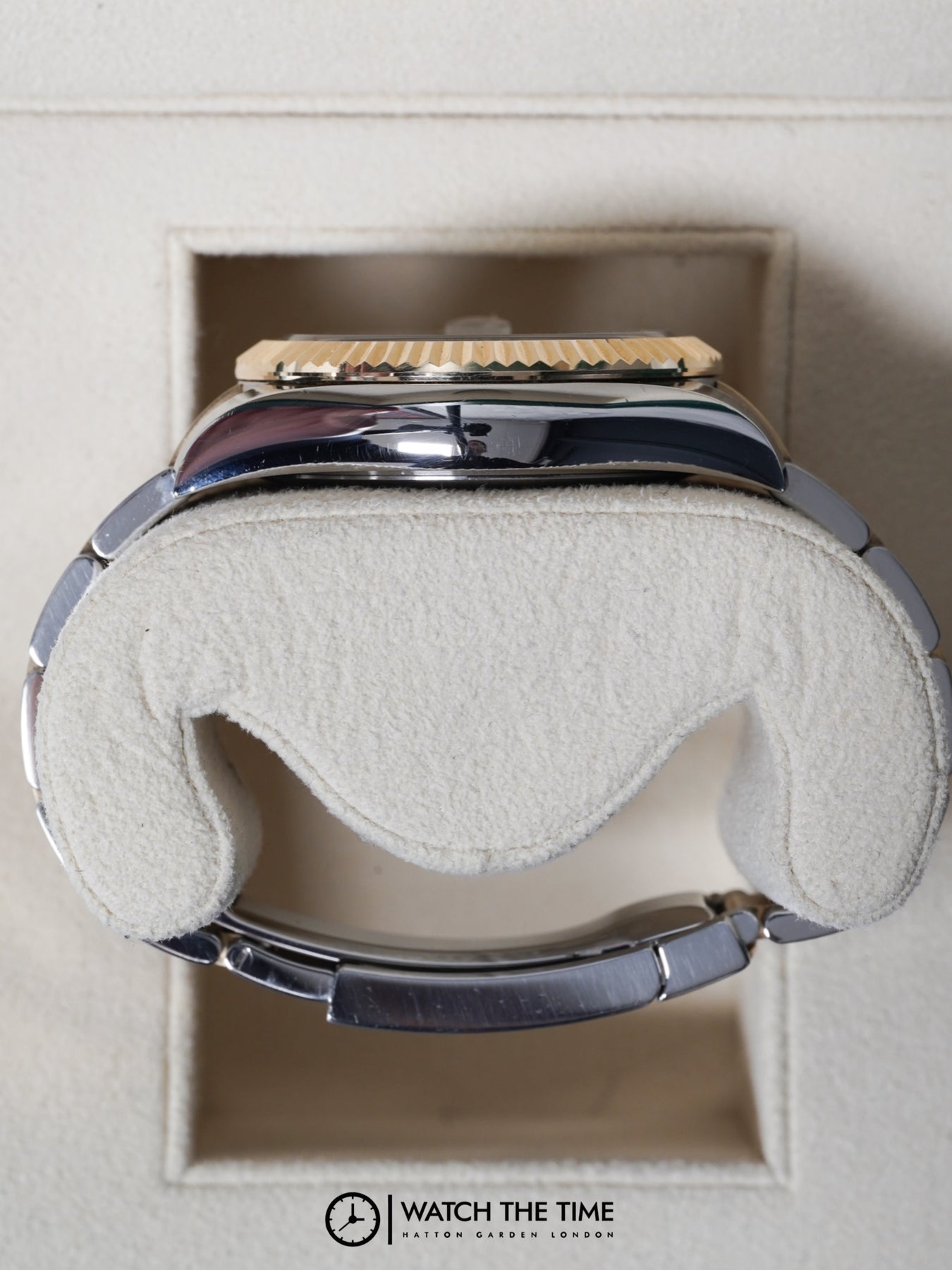 42mm stainless steel & yellow gold case, yellow gold fluted bezel. Crown set on the right side of the watch as well as the date. White dial, stainless steel & yellow gold oyster bracelet.