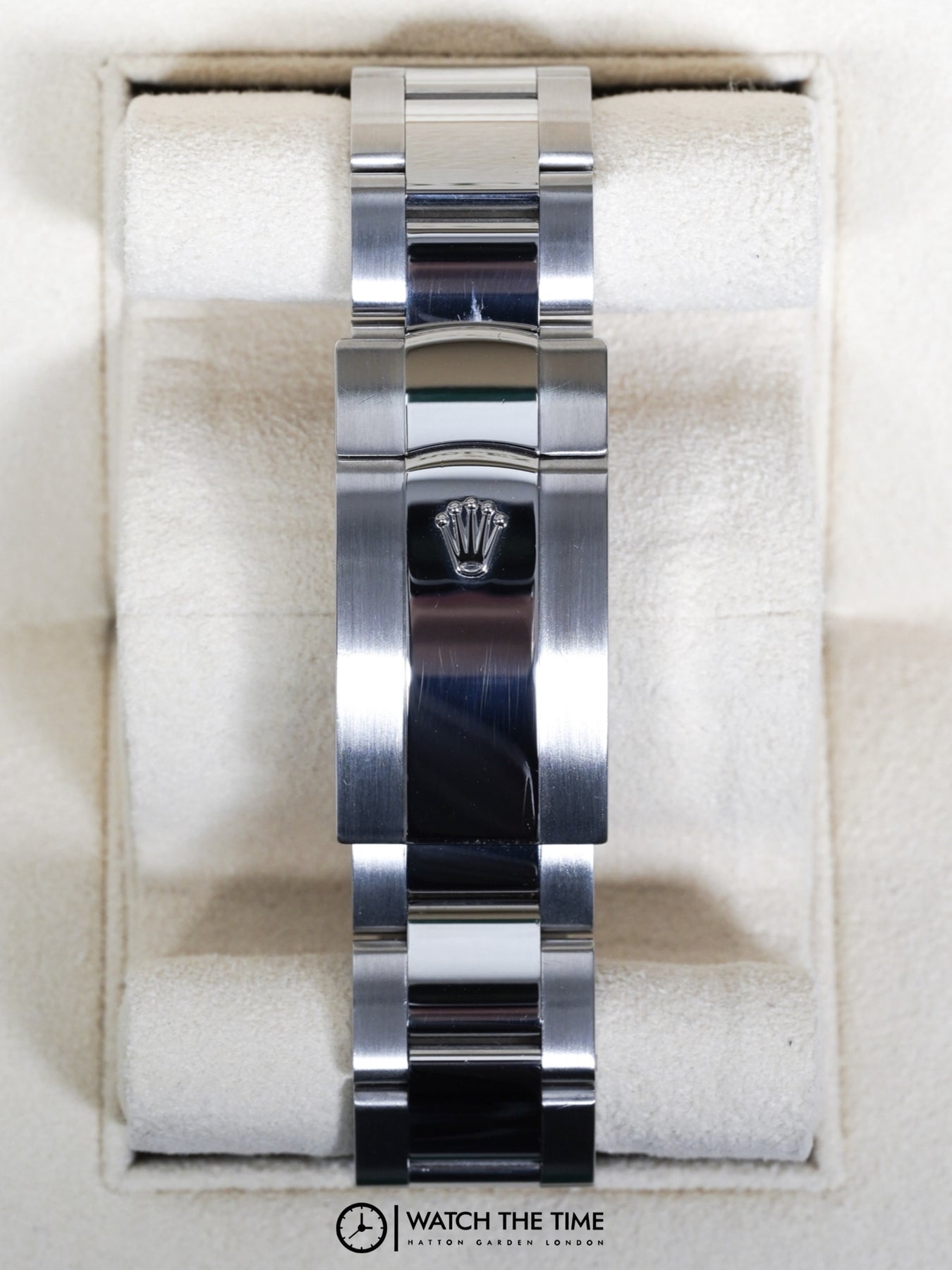 42mm stainless steel case, white gold fluted bezel. Crown set on the right side of the watch as well as the date. Green dial, stainless steel oyster bracelet.