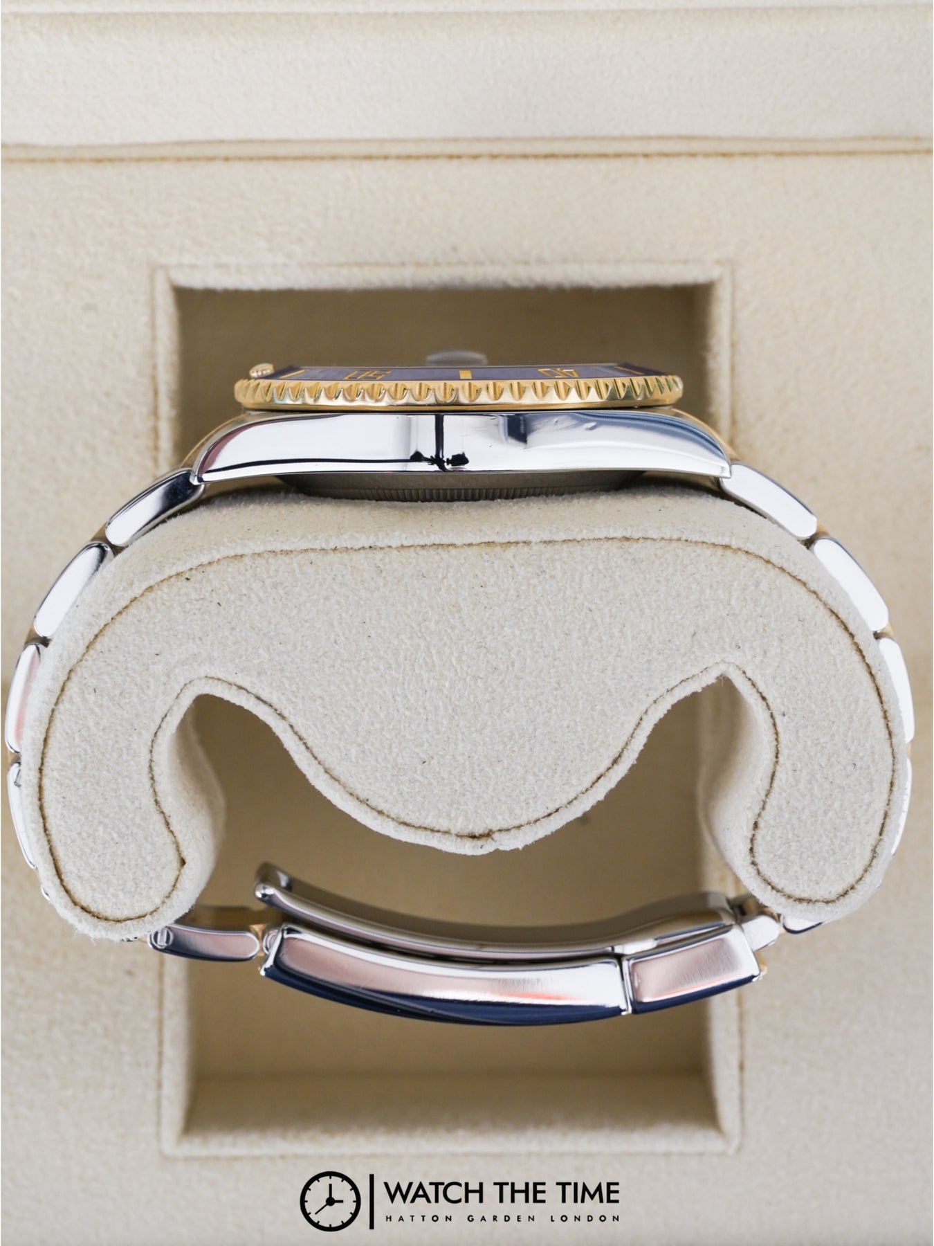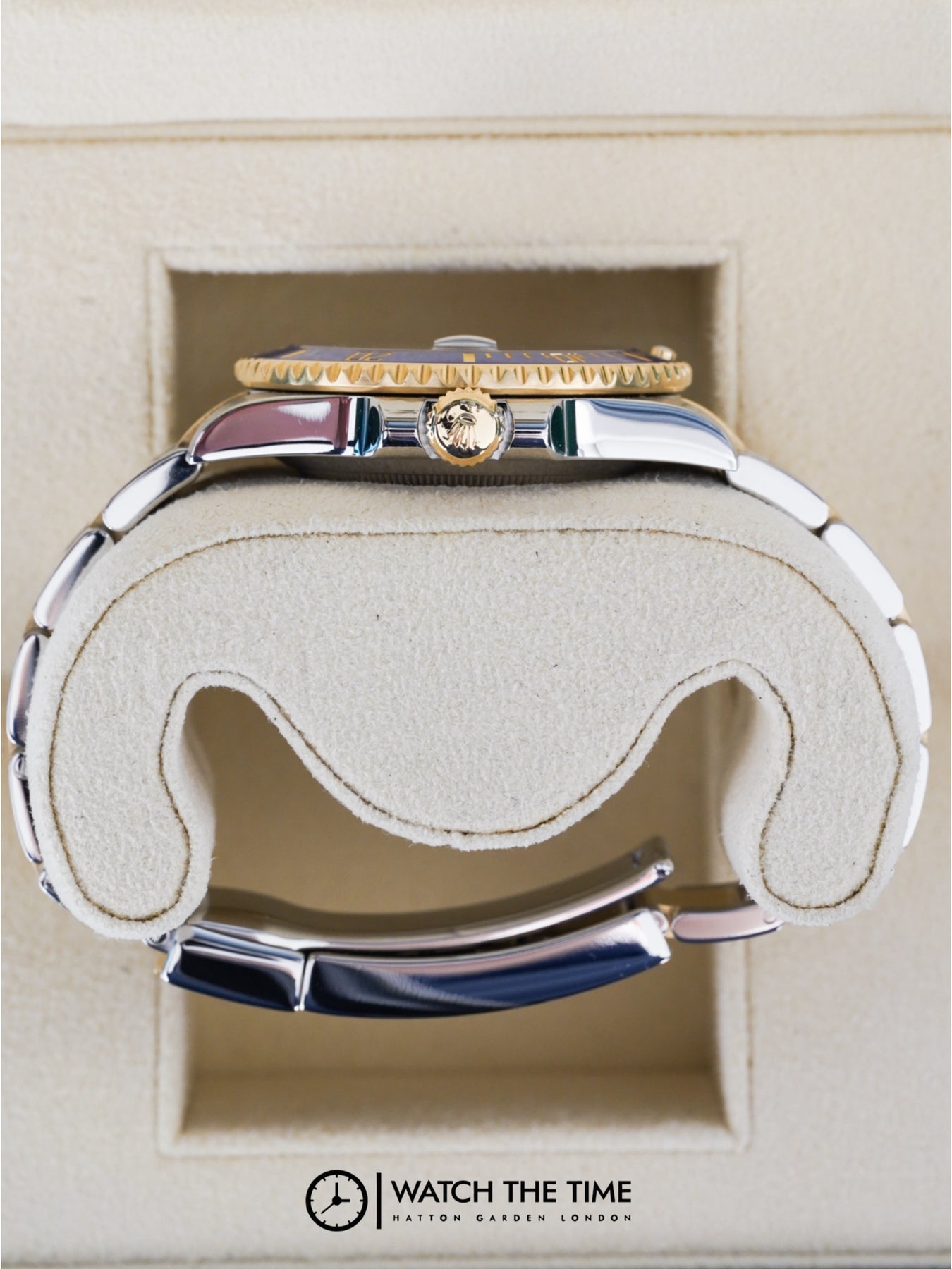 40mm stainless steel & yellow gold case. Crown set on the right side of the watch as well as the date. Blue dial, yellow gold & stainless steel oyster bracelet.