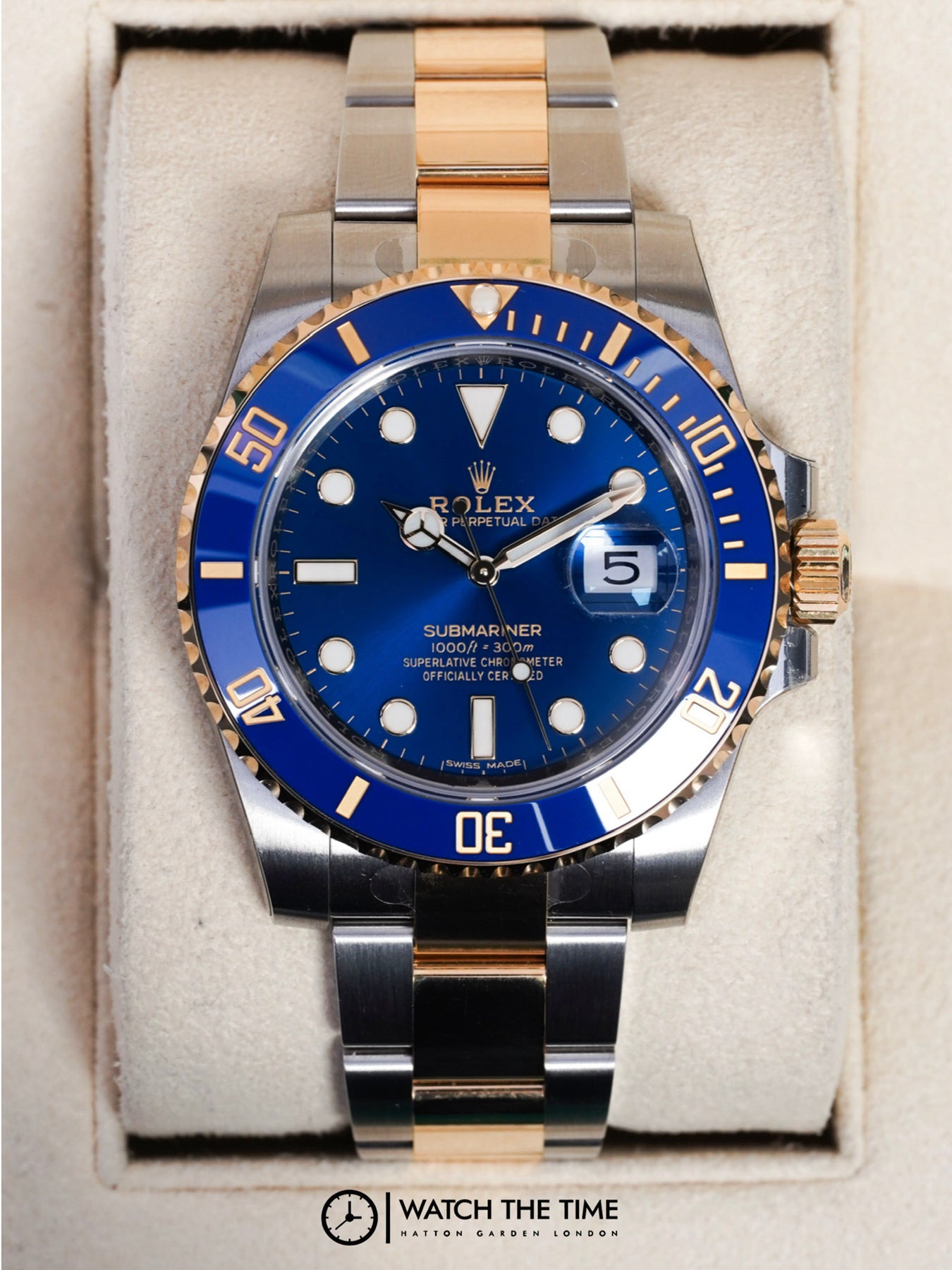 40mm stainless steel & yellow gold case, Crown set on the right side of the watch as well as the date. Blue dial, stainless steel & yellow gold oyster bracelet.