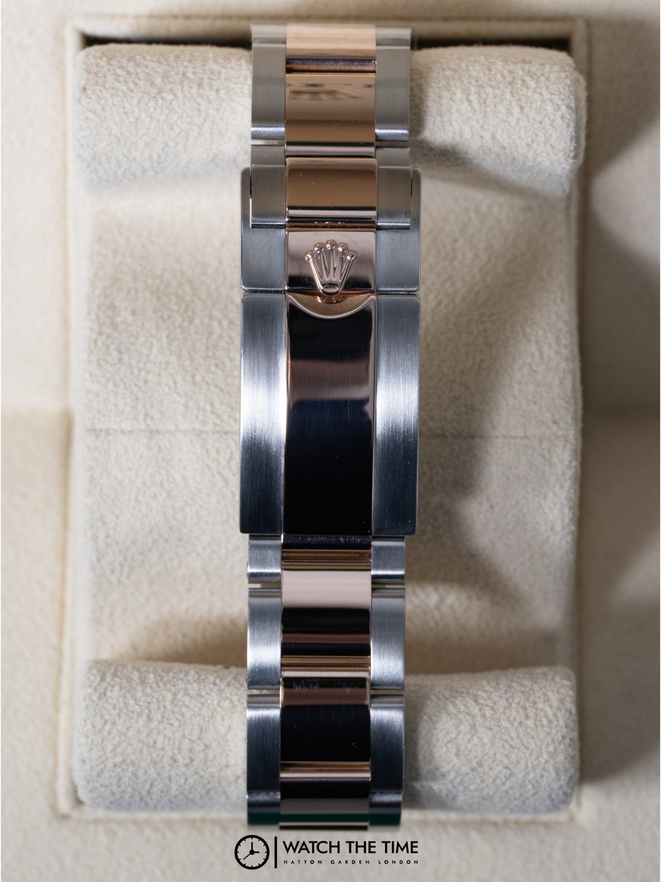 40mm rose gold & stainless steel case, crown set on the right side of the watch as well as the date. Chocolate dial, rose gold & stainless steel oyster bracelet.