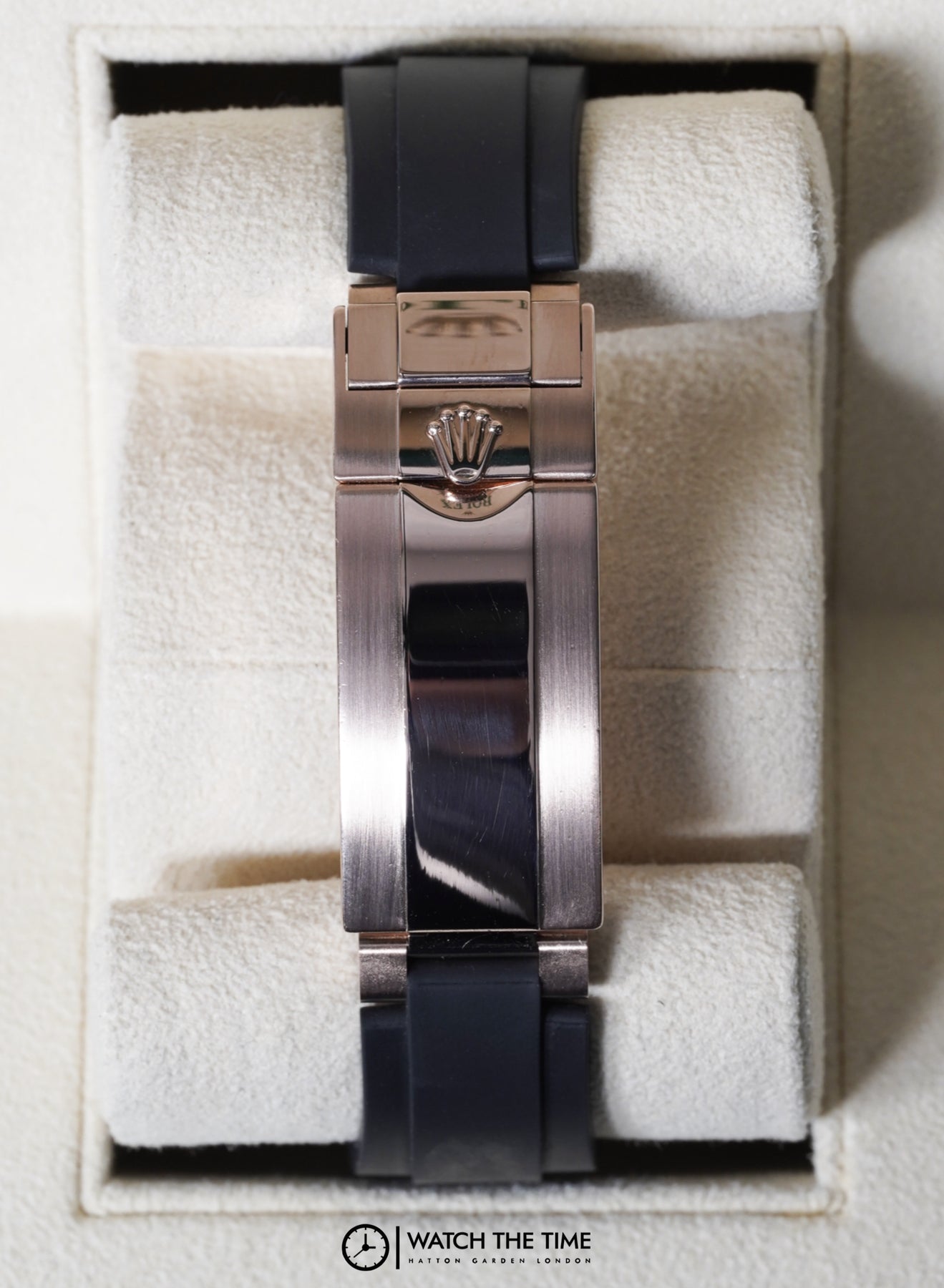 40mm rose gold case, crown set on the right side of the watch as well as the date. Black dial, oysterflex strap.
