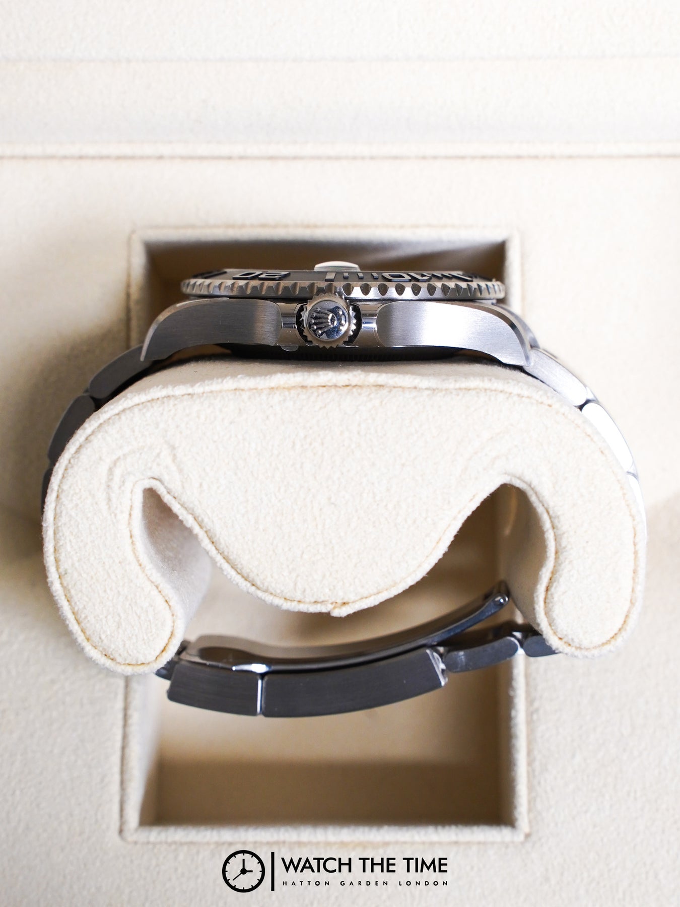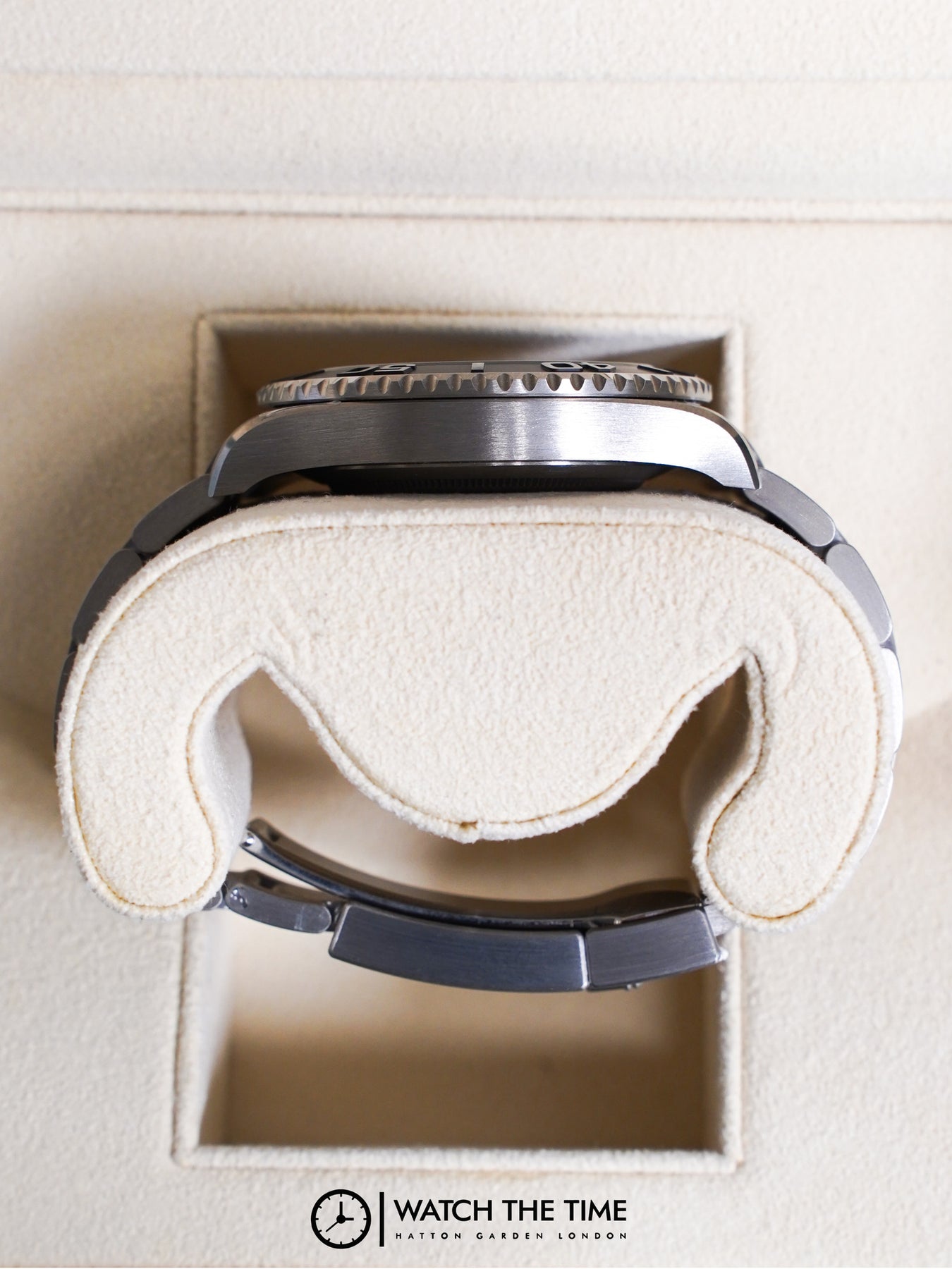 42mm Titanium Case, Ceramic Bezel, Crown Set On The Right Side As Well As The Date. Independent 12 hour Hand, Black Dial, Titanium Oyster Bracelet.