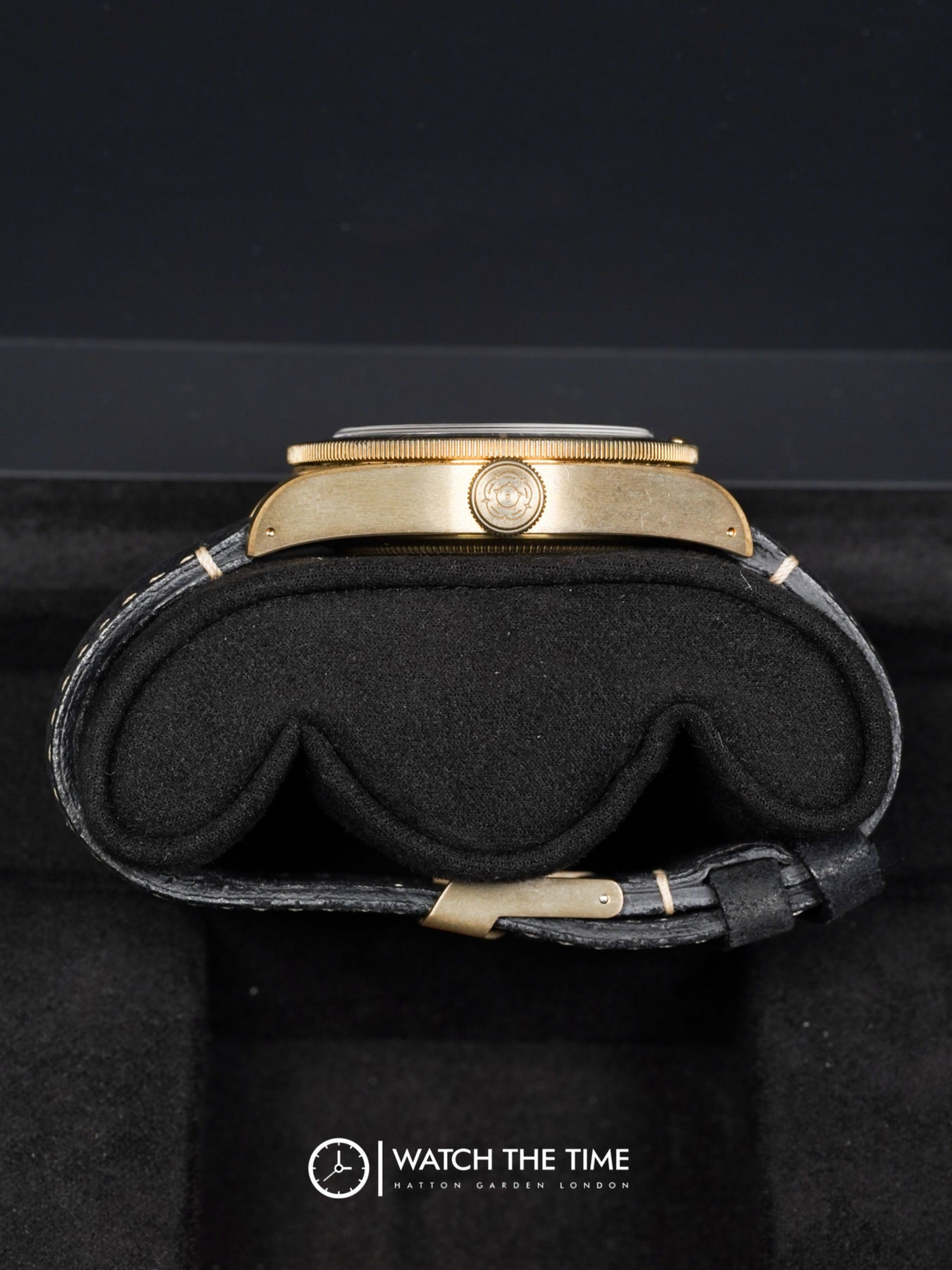 43mm Bronze case with bronze PVD-coated steel back and satin finish Case, Black Bezel, Crown Set On The Right Side As Well As The Date. Independent 12 hour Hand, Black Dial, Black Leather Strap.