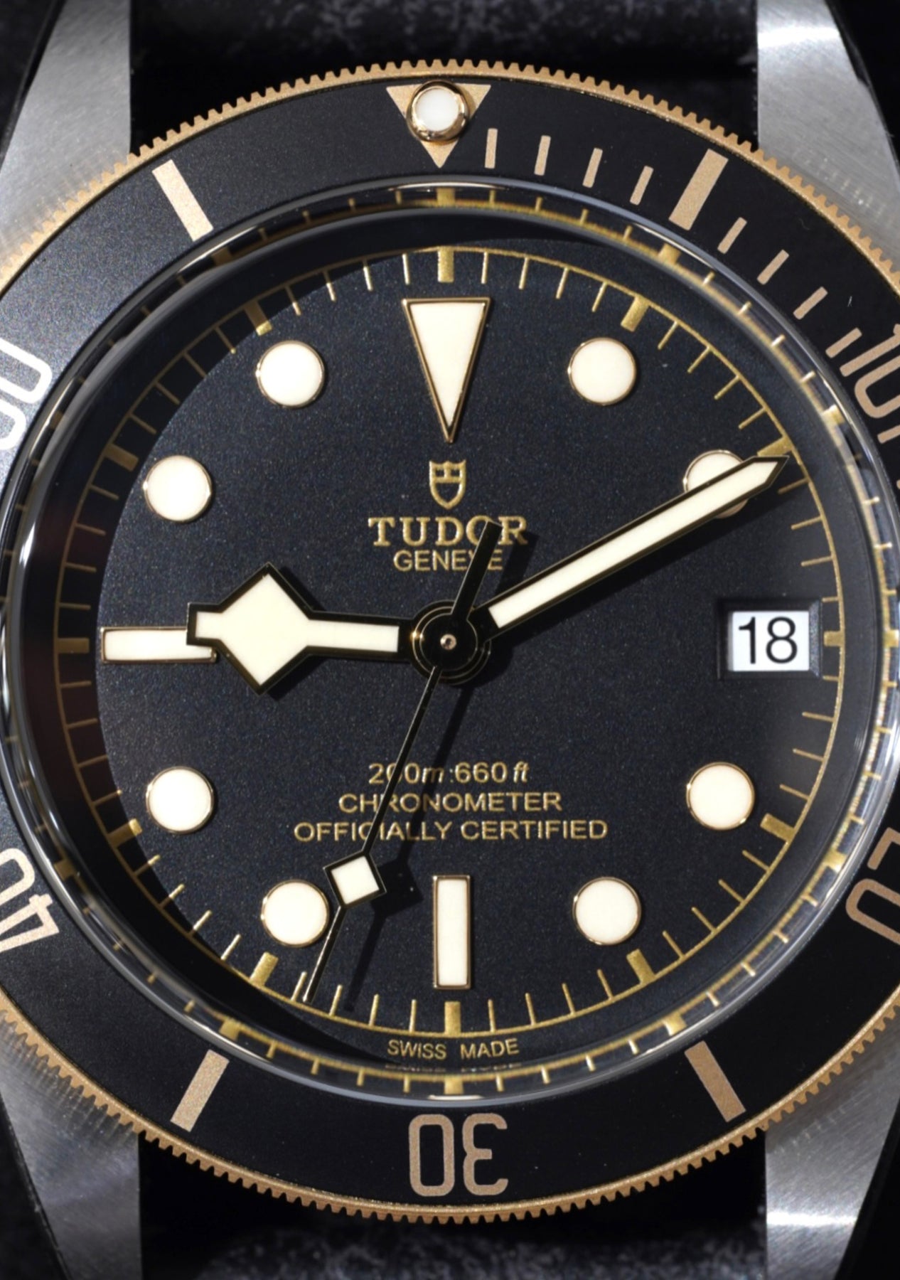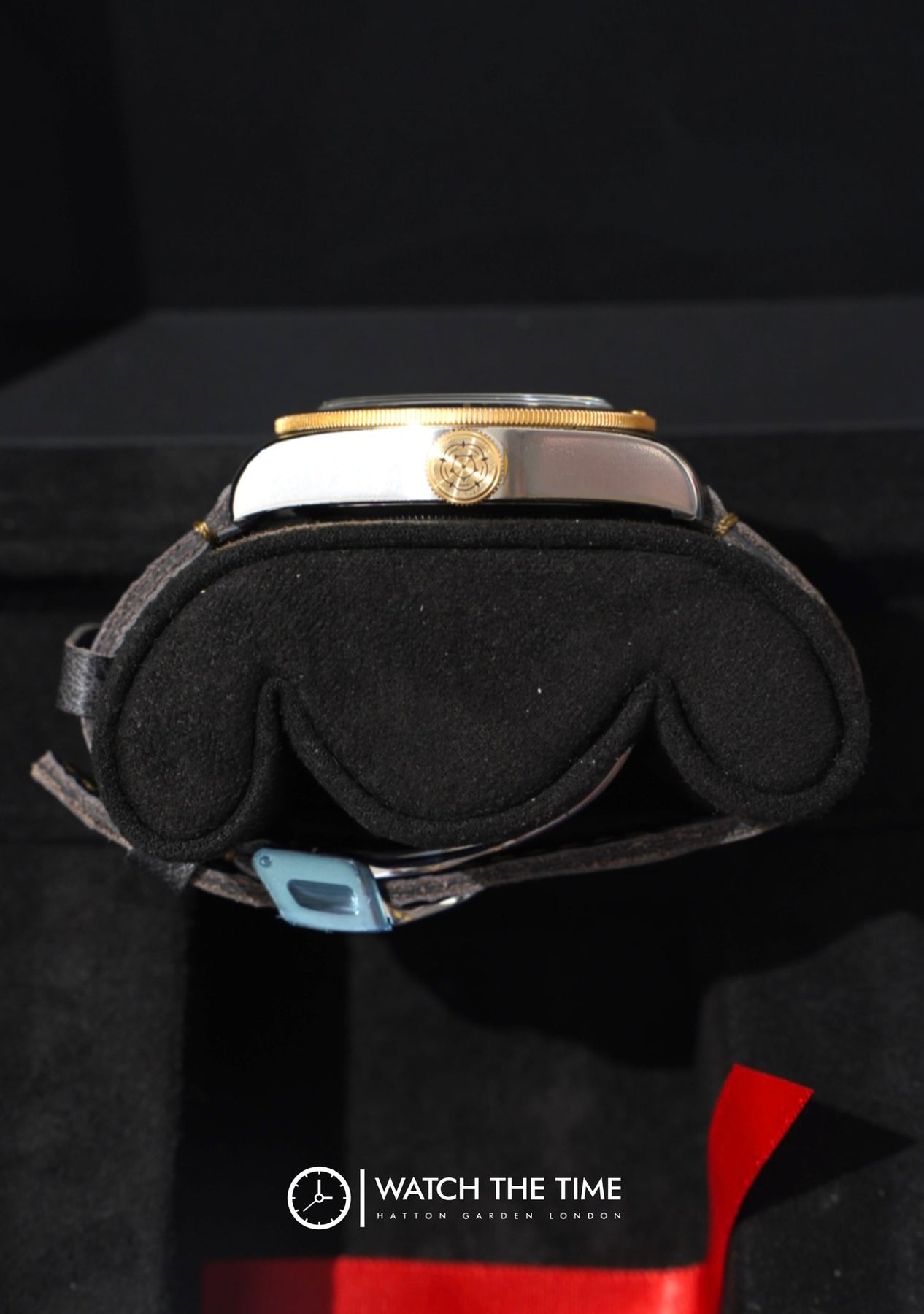 41mm stainless steel case, stainless steel unidirectional bezel covered by a yellow gold cap. Crown set on the right side of the watch as well as the date. Black dial, brown leather strap.