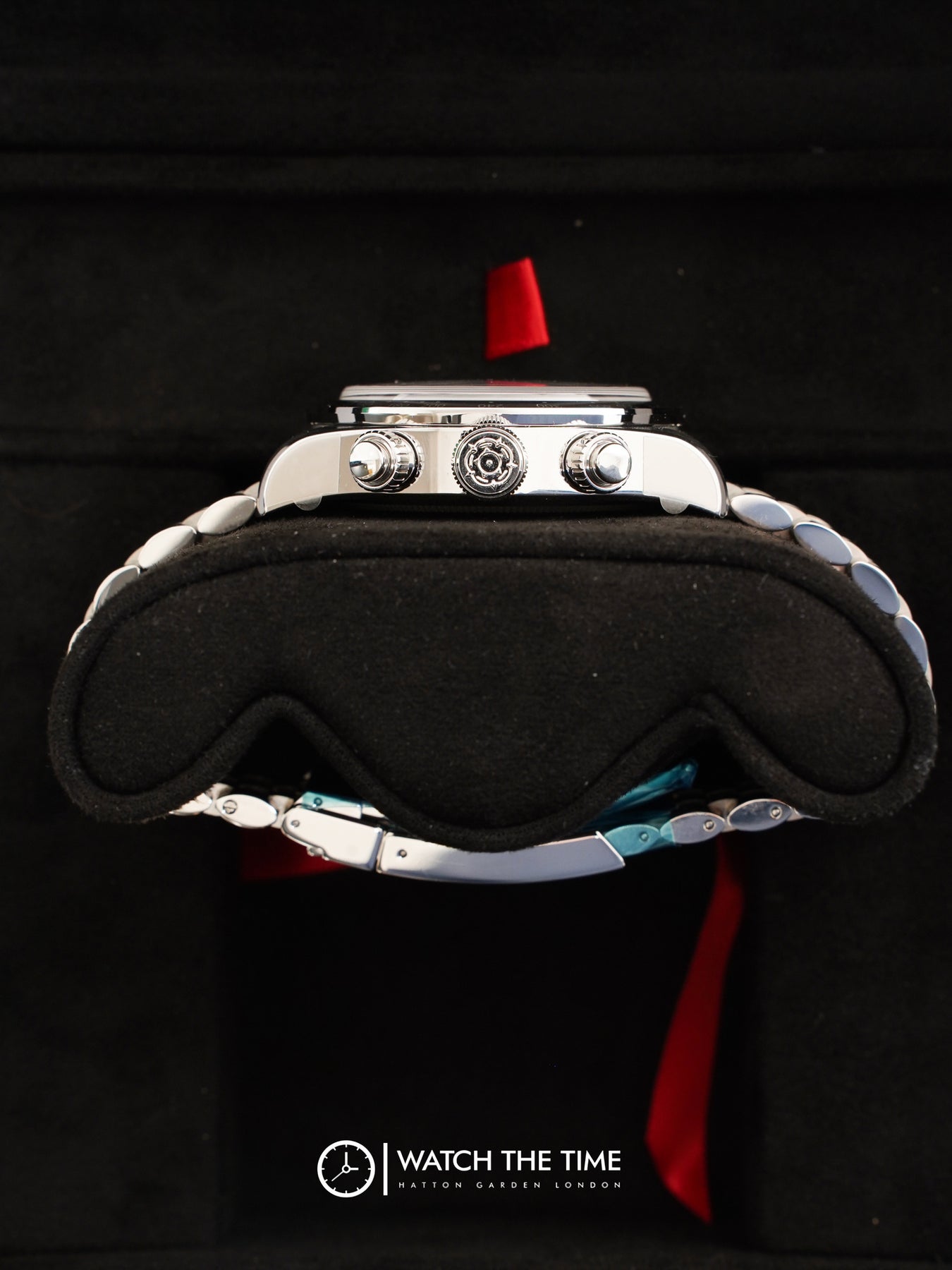 41mm Stainless Steel Case, Ceramic Bezel, Crown Set On The Right Side As Well As The Date. Independent 12 hour Hand, Pink Dial, Stainless Steel Jubilee Bracelet.