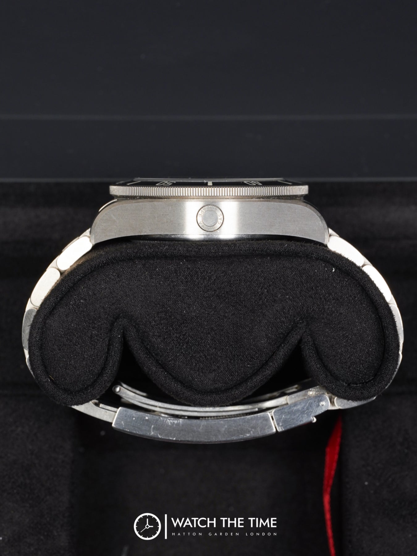 42mm titanium case, matte black ceramic bezel. Crown set on the right side of the watch as well as the date. Matte black dial, titanium bracelet.